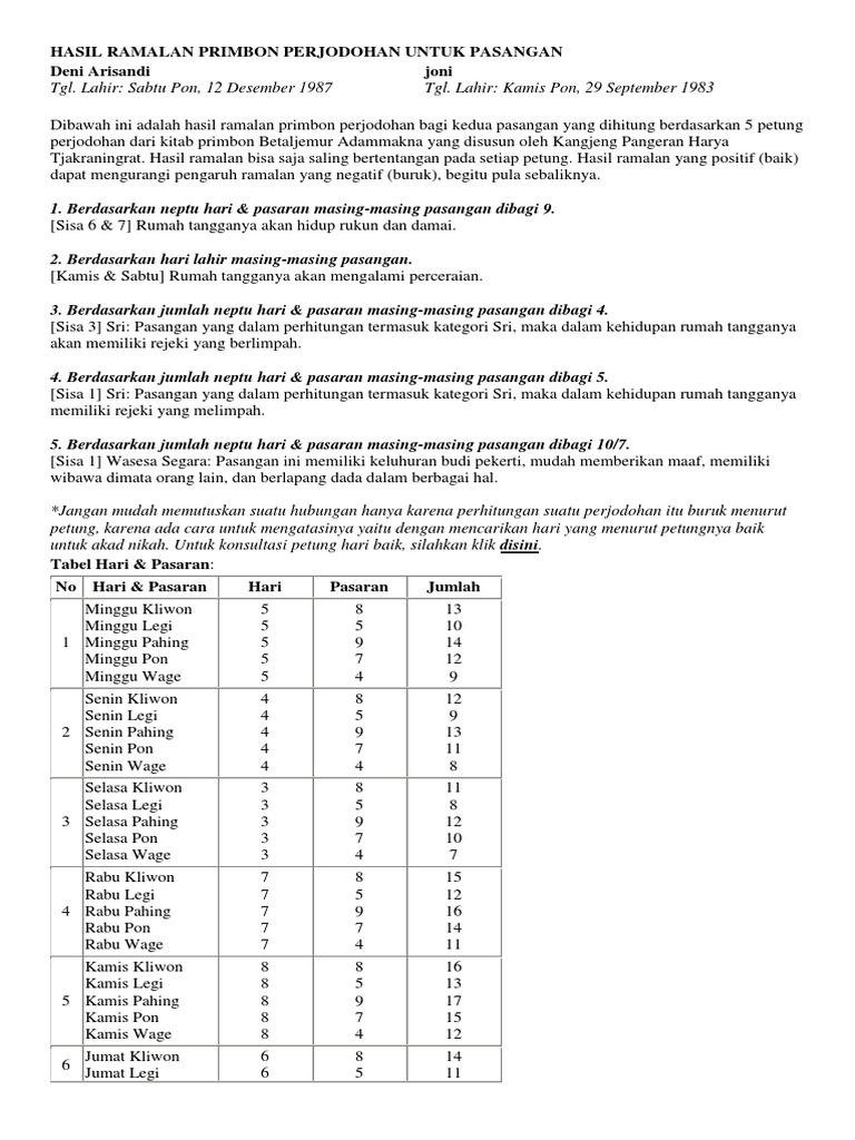 Jadi, jika neptu calon pengantin berjumlah 1, 9, 17, 25, ataupun 33, maka kemungkinan besar pasangan tersebut akan pisah di tengah jalan. Langkah menghitung weton dengan jumlah neptu: Sisa 1 waseso segoro artinya : Pengertian jumlah neptu hari dan pasaran adalah besaran nilai yang dihitung dengan menjumlahkan nilai neptu hari dengan nilai neptu pasaran. Jumlah neptu ini terbilang sangat kecil, yaitu 8 jodoh selasa legi. Gedhong = kaya harta benda 4. Neptu weton terbaik dalam perjodohan menurut perhitungan primbon jawa primbon jawa kerabat sunan. Kelemahan amp kelebihan neptu weton jodoh ketemu 26 27 28 29 30 31 primbon jawa syari ah ms172. Weton sisa neptu 4 neptu bulan dan tahun jawa. Kepribadiannya mudah sekali tersinggung tetapi pandai dalam bergaul dan pandai dalam 2. Jadi gabungan kedua neptu mempelai sama dengan 29. Pati = mati dalam arti. Jumlah neptu pasangan 29 + neptu 9 = 38 kemudian dibagi 5 berarti sisa 3 dan menurut daftar hari pernikahan berdasarkan weton adalah papan dan sangat direkomendasikan.